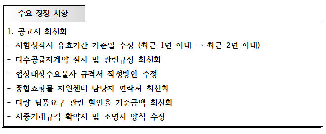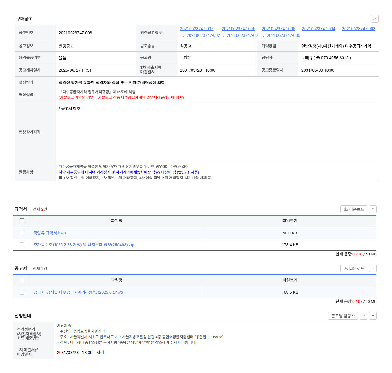 참고자료 [MAS 구매입찰공고] 국탕류 - 변경공고 작성자 al***** 작성일 2025-06-30 12:39 조회 320 ☞나라장터 종합쇼핑몰 바로가기. '나라장터 종합쇼핑몰' 접속 후, 중앙 우측 구매공고 팝업을 열어, 공고일정 지정 후 공고명으로 검색하세요. [출처 : 나라장터 조달청] 좋아요 0 싫어요 0 인쇄 « [MAS 구매입찰공고] 즉석식사또는조리된곡물외 1종 - 변경공고 [MAS 구매입찰공고] 수산물가공품외 6종 - 변경공고 » 목록보기 Powered by KBoard 에이치디로지스 주식회사 / 대표이사 : 정홍두 / 주소 : 경기도 남양주시 순화궁로 249, 파란곤스퀘어 N-604 사업자등록번호 : 745-87-02117 / 대표전화 : 031-570-2988 / 팩스 : 031-570-2989 Copyright ⓒ 2021 에이치디로지스 주식회사, All Riights Reserved. 개인정보처리방침 이메일수집거부