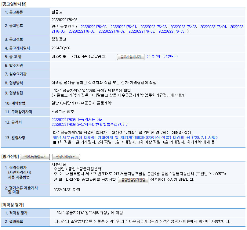 참고자료 [MAS 구매입찰공고] 비스킷또는쿠키외 4종 작성자 al***** 작성일 2024-03-15 14:23 조회 510 ☞나라장터 종합쇼핑몰 다수공급자계약 구매입찰공고 바로가기. [출처 : 조달청 나라장터] 좋아요 0 싫어요 0 인쇄 « [MAS 구매입찰공고] 혼합조미료외 4종 [MAS 구매입찰공고] 상온보관용빵외 6종 » 목록보기 Powered by KBoard 에이치디로지스 주식회사 / 대표이사 : 정홍두 / 주소 : 경기도 남양주시 순화궁로 249, 파란곤스퀘어 N-604 사업자등록번호 : 745-87-02117 / 대표전화 : 031-570-2988 / 팩스 : 031-570-2989 Copyright ⓒ 2021 에이치디로지스 주식회사, All Riights Reserved. 개인정보처리방침 이메일수집거부