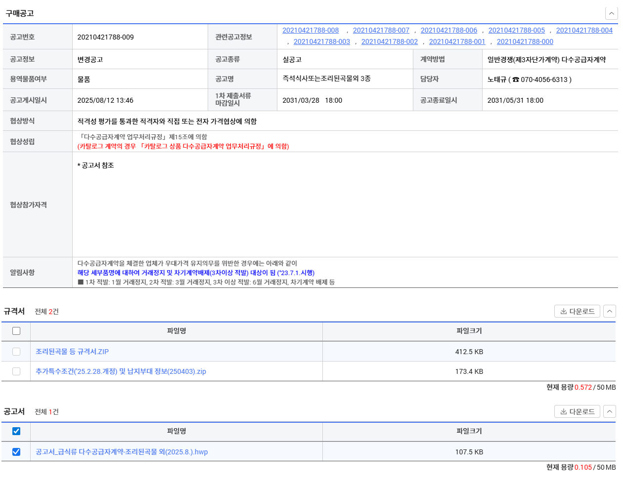 참고자료 [MAS 구매입찰공고] 즉석식사또는조리된곡물외 3종 - 변경공고 작성자 al***** 작성일 2025-08-20 11:44 조회 268 ☞나라장터 종합쇼핑몰 바로가기. '나라장터 종합쇼핑몰' 접속 후, 중앙 우측 구매공고 팝업을 열어, 공고일정 지정 후 공고명으로 검색하세요. [출처 : 나라장터 조달청] 좋아요 0 싫어요 0 인쇄 « [MAS 구매입찰공고] 식초외 6종 - 변경공고 [MAS 구매입찰공고] 수산물가공품외 6종 - 변경공고 » 목록보기 Powered by KBoard 에이치디로지스 주식회사 / 대표이사 : 정홍두 / 주소 : 경기도 남양주시 순화궁로 249, 파란곤스퀘어 N-604 사업자등록번호 : 745-87-02117 / 대표전화 : 031-570-2988 / 팩스 : 031-570-2989 Copyright ⓒ 2021 에이치디로지스 주식회사, All Riights Reserved. 개인정보처리방침 이메일수집거부