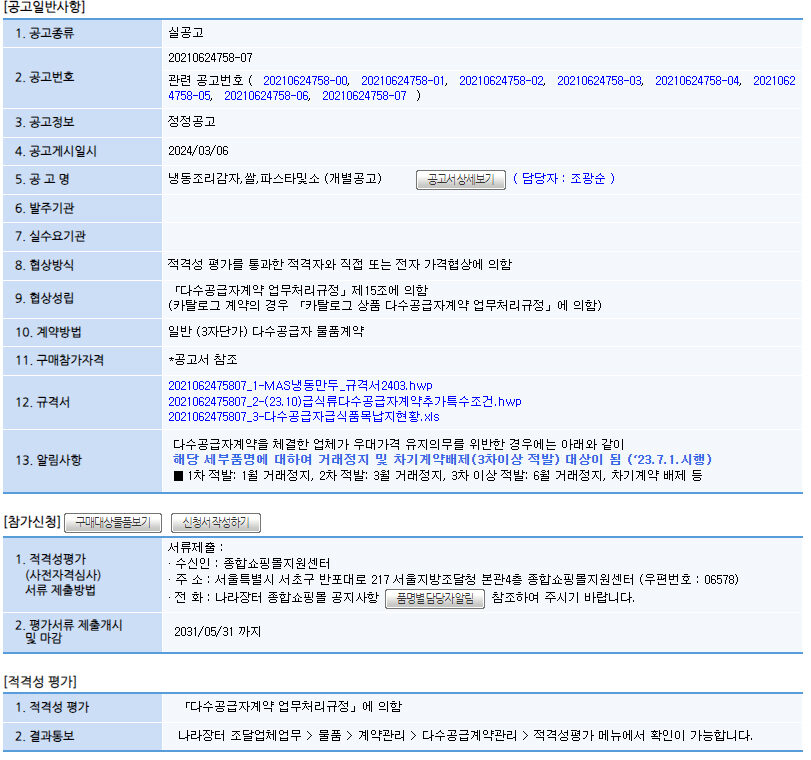 참고자료 [MAS 구매입찰공고] 냉동조리감자,쌀,파스타및소 작성자 al***** 작성일 2024-03-15 14:45 조회 512 ☞나라장터 종합쇼핑몰 다수공급자계약 구매입찰공고 바로가기. [출처 : 조달청 나라장터] 좋아요 0 싫어요 0 인쇄 « [MAS 구매입찰공고] 즉석식사또는조리된곡물외 1종 [MAS 구매입찰공고] 상온보관우유또는버터제품 » 목록보기 Powered by KBoard 에이치디로지스 주식회사 / 대표이사 : 정홍두 / 주소 : 경기도 남양주시 순화궁로 249, 파란곤스퀘어 N-604 사업자등록번호 : 745-87-02117 / 대표전화 : 031-570-2988 / 팩스 : 031-570-2989 Copyright ⓒ 2021 에이치디로지스 주식회사, All Riights Reserved. 개인정보처리방침 이메일수집거부