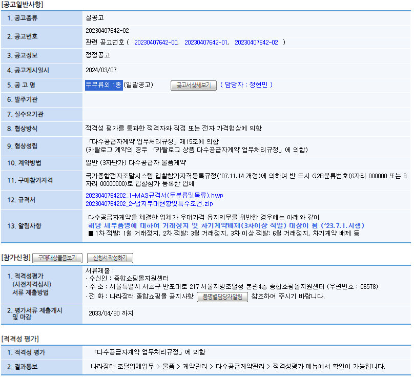 참고자료 [MAS 구매입찰공고] 두부류외 1종 작성자 al***** 작성일 2024-03-15 14:51 조회 593 ☞나라장터 종합쇼핑몰 다수공급자계약 구매입찰공고 바로가기. [출처 : 조달청 나라장터] 좋아요 0 싫어요 0 인쇄 « [MAS 구매입찰공고] 간장외 5종 [MAS 구매입찰공고] 단무지 » 목록보기 Powered by KBoard 에이치디로지스 주식회사 / 대표이사 : 정홍두 / 주소 : 경기도 남양주시 순화궁로 249, 파란곤스퀘어 N-604 사업자등록번호 : 745-87-02117 / 대표전화 : 031-570-2988 / 팩스 : 031-570-2989 Copyright ⓒ 2021 에이치디로지스 주식회사, All Riights Reserved. 개인정보처리방침 이메일수집거부