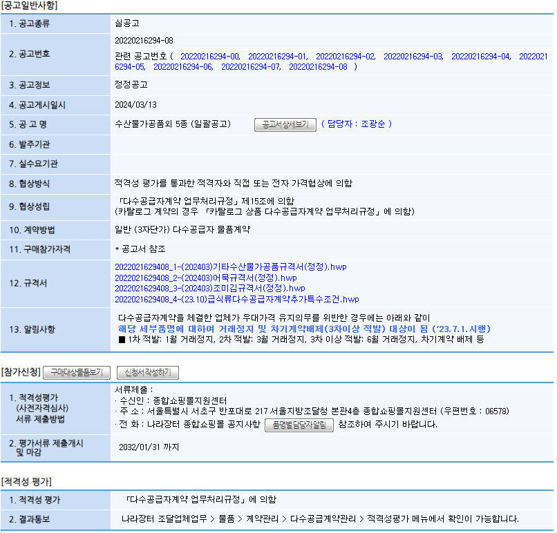 참고자료 [MAS 구매입찰공고] 수산물가공품외 5종 작성자 al***** 작성일 2024-03-15 14:58 조회 609 ☞나라장터 종합쇼핑몰 다수공급자계약 구매입찰공고 바로가기. [출처 : 조달청 나라장터] 좋아요 0 싫어요 0 인쇄 « [MAS 구매입찰공고] 열무김치외 7종 [MAS 구매입찰공고] 청량음료외 1종 » 목록보기 Powered by KBoard 에이치디로지스 주식회사 / 대표이사 : 정홍두 / 주소 : 경기도 남양주시 순화궁로 249, 파란곤스퀘어 N-604 사업자등록번호 : 745-87-02117 / 대표전화 : 031-570-2988 / 팩스 : 031-570-2989 Copyright ⓒ 2021 에이치디로지스 주식회사, All Riights Reserved. 개인정보처리방침 이메일수집거부