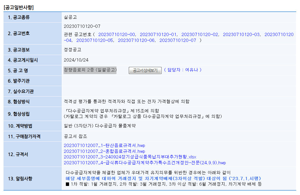 참고자료 [MAS 구매입찰공고] 청량음료외 2종 (일괄공고) 작성자 al***** 작성일 2024-10-25 12:28 조회 423 ☞나라장터 종합쇼핑몰 바로가기. '나라장터 종합쇼핑몰' 접속 후, 중앙 우측 구매공고 팝업을 열어, 공고일정 지정 후 공고명으로 검색하세요. [출처 : 조달청 나라장터] 좋아요 0 싫어요 0 인쇄 « [MAS 구매입찰공고] 식초외 6종 (일괄공고) [MAS 구매입찰공고] 간장외 5종 (일괄공고) » 목록보기 Powered by KBoard 에이치디로지스 주식회사 / 대표이사 : 정홍두 / 주소 : 경기도 남양주시 순화궁로 249, 파란곤스퀘어 N-604 사업자등록번호 : 745-87-02117 / 대표전화 : 031-570-2988 / 팩스 : 031-570-2989 Copyright ⓒ 2021 에이치디로지스 주식회사, All Riights Reserved. 개인정보처리방침 이메일수집거부