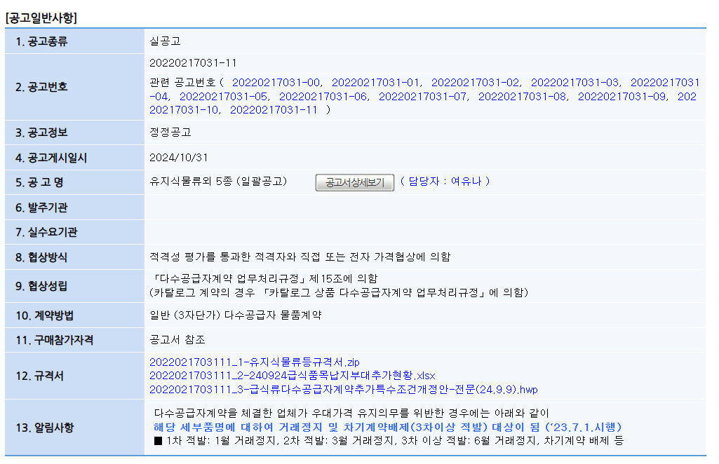참고자료 [MAS 구매입찰공고] 유지식물류외 5종 (일괄공고) 작성자 al***** 작성일 2024-10-31 09:55 조회 504 ☞나라장터 종합쇼핑몰 바로가기. '나라장터 종합쇼핑몰' 접속 후, 중앙 우측 구매공고 팝업을 열어, 공고일정 지정 후 공고명으로 검색하세요. [출처: 나라장터 조달청] 좋아요 0 싫어요 0 인쇄 « [MAS 구매입찰공고] 혼합조미료외 3종 (일괄공고) [MAS 구매입찰공고] 상온담백한파스타또는면류 (개별공고) » 목록보기 Powered by KBoard 에이치디로지스 주식회사 / 대표이사 : 정홍두 / 주소 : 경기도 남양주시 순화궁로 249, 파란곤스퀘어 N-604 사업자등록번호 : 745-87-02117 / 대표전화 : 031-570-2988 / 팩스 : 031-570-2989 Copyright ⓒ 2021 에이치디로지스 주식회사, All Riights Reserved. 개인정보처리방침 이메일수집거부