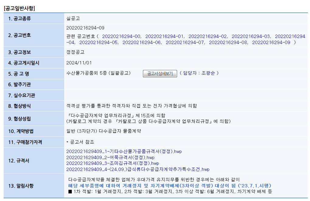 참고자료 [MAS 구매입찰공고] 수산물가공품외 5종 (일괄공고) 작성자 al***** 작성일 2024-11-05 11:12 조회 589 ☞나라장터 종합쇼핑몰 다수공급자계약 구매입찰공고 바로가기. [출처 : 나라장터 조달청] 좋아요 0 싫어요 0 인쇄 « [MAS 구매입찰공고] 상온보관우유또는버터제품 (개별공고) [MAS 구매입찰공고] 냉동조리감자,쌀,파스타및소 (개별공고) » 목록보기 Powered by KBoard 에이치디로지스 주식회사 / 대표이사 : 정홍두 / 주소 : 경기도 남양주시 순화궁로 249, 파란곤스퀘어 N-604 사업자등록번호 : 745-87-02117 / 대표전화 : 031-570-2988 / 팩스 : 031-570-2989 Copyright ⓒ 2021 에이치디로지스 주식회사, All Riights Reserved. 개인정보처리방침 이메일수집거부