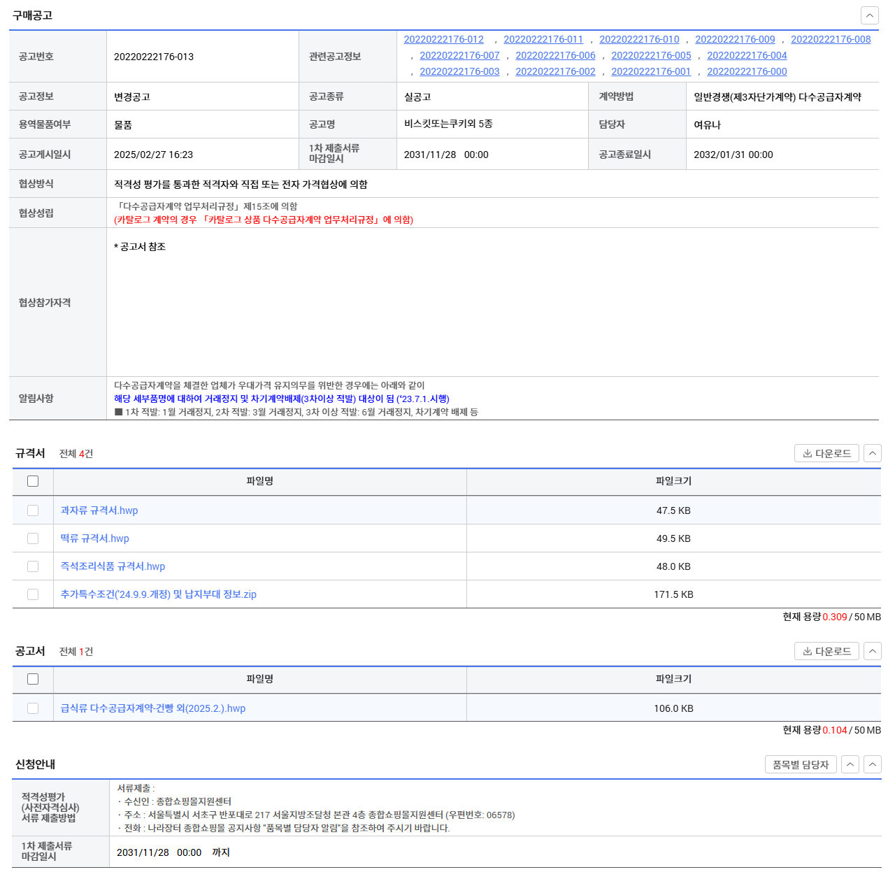 참고자료 [MAS 구매입찰공고] 비스킷또는쿠키외 5종_일반경쟁(제3자단가계약) 다수공급자계약 작성자 al***** 작성일 2025-03-05 10:52 조회 354 ☞ 나라장터 종합쇼핑몰 바로가기. '나라장터 종합쇼핑몰' 접속 후, 중앙 우측 구매공고 팝업을 열어, 공고일정 지정 후 공고명으로 검색하세요. [출처 : 나라장터 조달청] 좋아요 0 싫어요 0 인쇄 « [MAS 구매입찰공고] 유지식물류외 5종)_일반경쟁(제3자단가계약) 다수공급자계약 [MAS 구매입찰공고] 병포장또는보존처리된주스외 1종_변경공고 » 목록보기 Powered by KBoard 에이치디로지스 주식회사 / 대표이사 : 정홍두 / 주소 : 경기도 남양주시 순화궁로 249, 파란곤스퀘어 N-604 사업자등록번호 : 745-87-02117 / 대표전화 : 031-570-2988 / 팩스 : 031-570-2989 Copyright ⓒ 2021 에이치디로지스 주식회사, All Riights Reserved. 개인정보처리방침 이메일수집거부