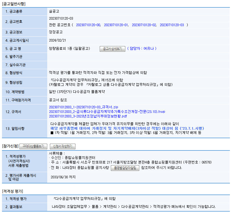 참고자료 [MAS 구매입찰공고] 청량음료외 1종 작성자 al***** 작성일 2024-03-15 14:10 조회 475 ☞나라장터 종합쇼핑몰 다수공급자계약 구매입찰공고 바로가기. [출처 : 조달청 나라장터] 좋아요 0 싫어요 0 인쇄 [MAS 구매입찰공고] 혼합조미료외 4종 » 목록보기 Powered by KBoard 에이치디로지스 주식회사 / 대표이사 : 정홍두 / 주소 : 경기도 남양주시 순화궁로 249, 파란곤스퀘어 N-604 사업자등록번호 : 745-87-02117 / 대표전화 : 031-570-2988 / 팩스 : 031-570-2989 Copyright ⓒ 2021 에이치디로지스 주식회사, All Riights Reserved. 개인정보처리방침 이메일수집거부